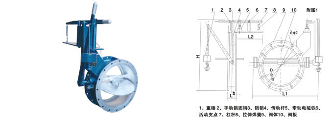 電磁式煤氣安全切斷閥DMF-0.1為法蘭連接,它主要由電磁鐵杠桿裝置、彈簧及重錘、閥體、閥板和軸等零件組成。閥門開啟時,重錘臂處于豎立位置,電源接通,重錘臂被鎖定機構鎖定,管道正常輸氣。當管道內介質壓力底于規定值或系統出現異常需立即切斷介質時,可通過相應的控制回路使電磁機構斷電,解除鎖定;重錘臂及閥板在重力的作用下,依順時針方向落下,閥門關閉。當需要恢復供氣時,將重錘臂連同重錘按逆時針方向轉至升至似堅直位置,鎖定機構復位,此時行程開關的接點閉合,電磁機構得電,重錘臂被鎖定。閥門又呈開啟狀態。